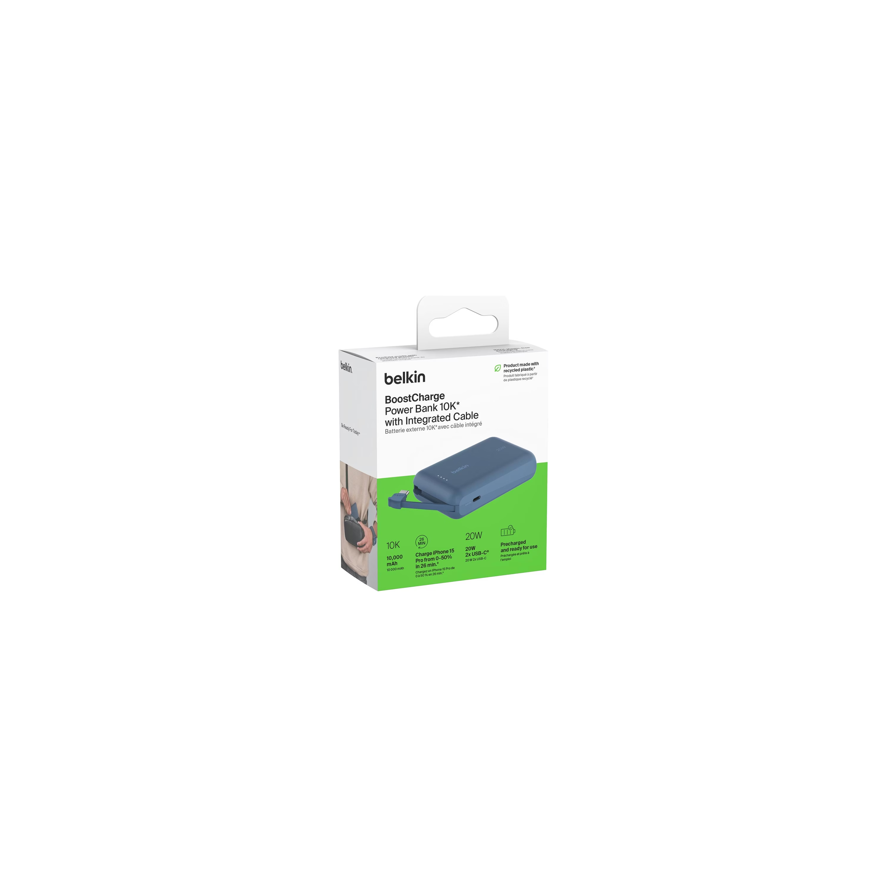 Batterie externe BELKIN BoostCharge 10 000 mAh bleue avec câble USB-C intégré. 2 ports USB-C, charge rapide PD 20W, autonomie jusqu’à 43h et recharge iPhone 15 Pro à 50 % en 26 min. Préchargée et conçue avec des matériaux recyclés, elle combine écologie, performance et praticité.