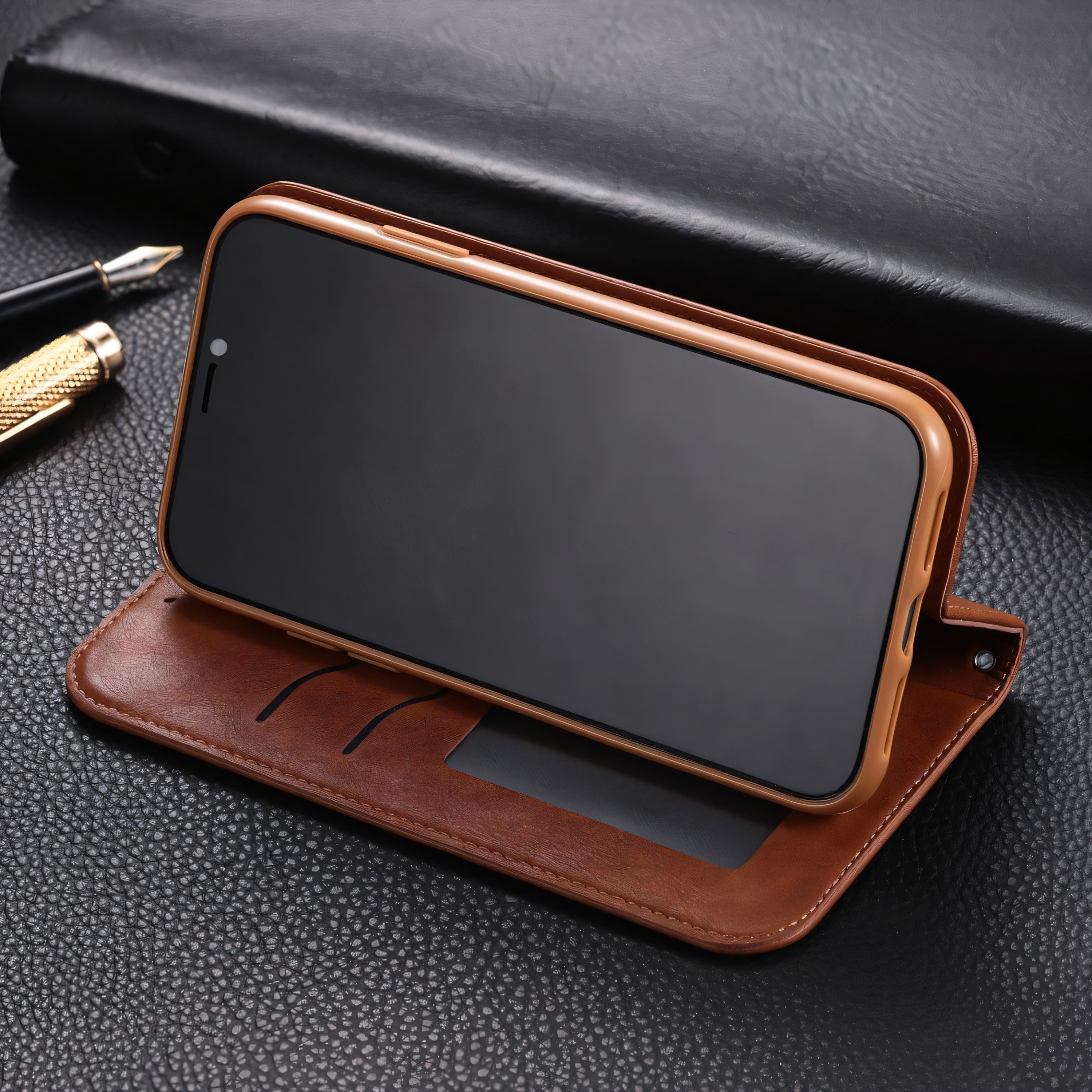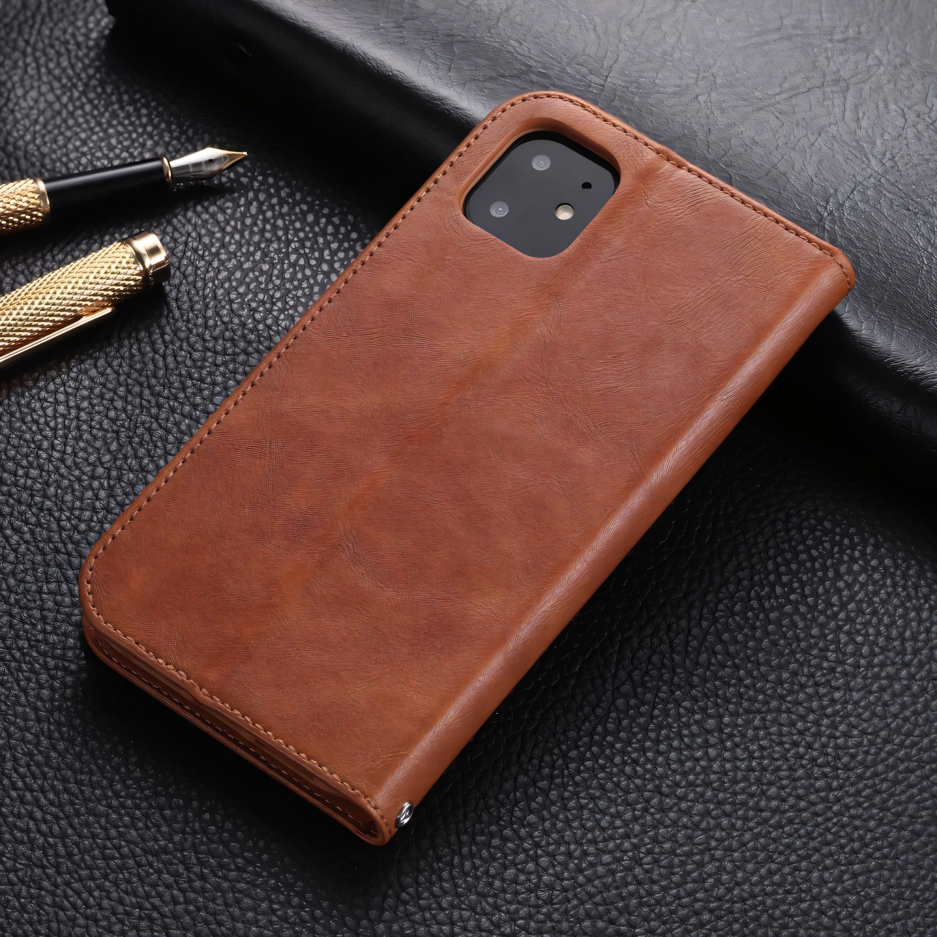 Cet étui de protection iPhone 11 Pro Max au style vintage en simili cuir de couleur marron est l'accessoire idéal pour protéger votre téléphone avec élégance. Spécifiquement conçu pour le modèle iPhone 11 Pro Max, cette coque offre une protection optimale grâce à sa fermeture qui protège efficacement votre téléphone des chocs, des rayures et de la poussière.